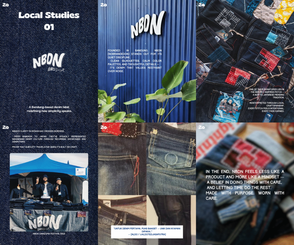 Their clean cuts and timeless silhouettes resonate far beyond Indonesia. NBDN’s works have been featured in denim exhibitions across Japan and Bangkok, introducing Indonesian craftsmanship to new audiences. Yet even with this international recognition, their identity remains rooted — an honest reflection of Bandung’s creative rhythm and the thoughtful hands that shape every garment.